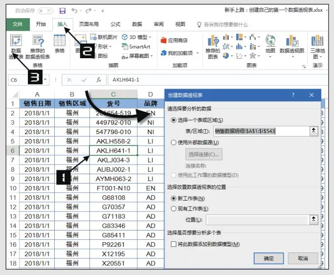 步骤1 在下图所示的销售明细流水账中选中任意一个单元格(如 C6),在【插入】选项卡中单击【数据透视表】按钮 ,弹出【创建数据透视表】对话框。