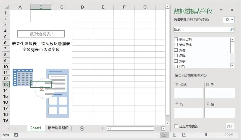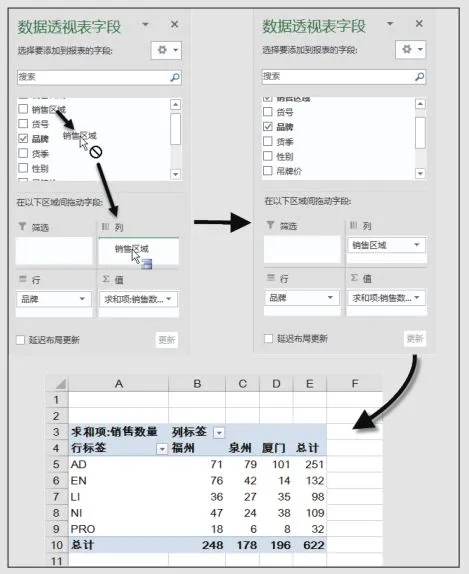 步骤4 在【数据透视表字段】窗格中选择“销售区域”字段并且按住鼠标左键不放,将其拖曳至【列】区域中,“销售区域”字段将作为列的形式出现在数据透视表中,最终完成的数据透视表如图所示。