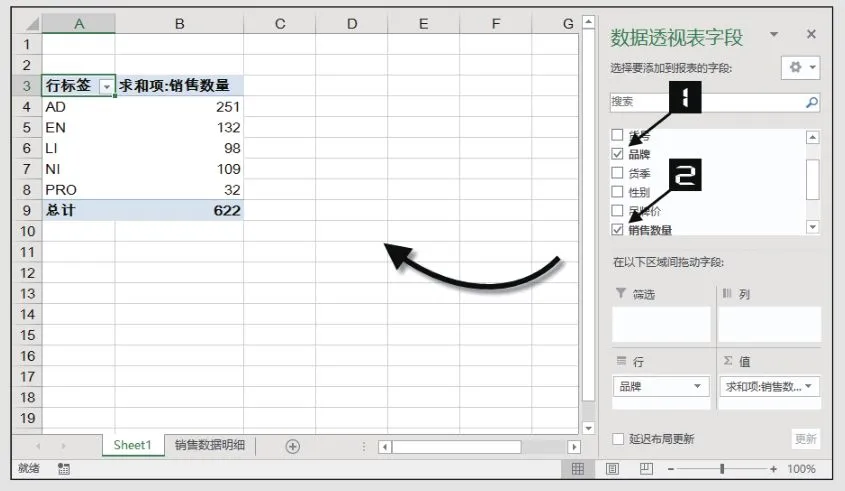 步骤3 在【数据透视表字段】窗格中依次选中“品牌”和“销售数量”字段的复选框,被添加的字段自动出现在【数据透视表字段】窗格的【行】区域和【值】区域,同时,相应的字段也被添加到数据透视表中。