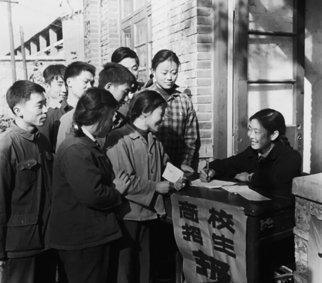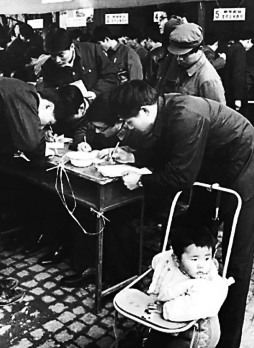 1977年的高考报名点,时常能看到大龄考生拖儿带女来报名