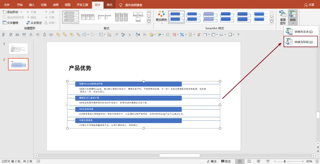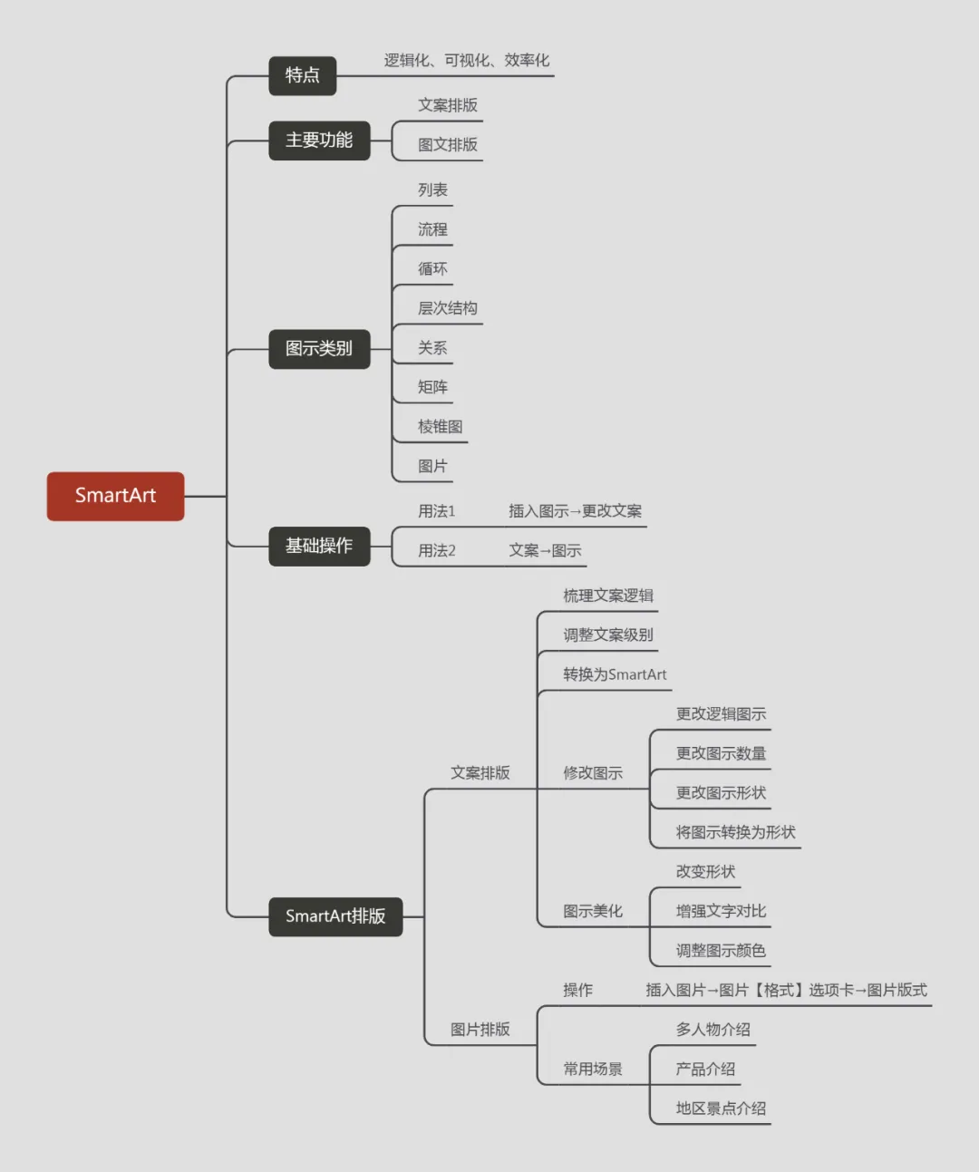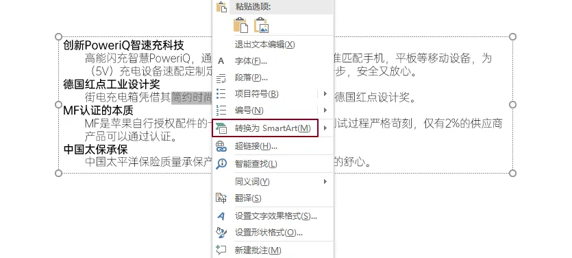 综上所述,SmartArt 是 PPT 中实用性很强但很少被用到的功能,它兼具逻辑化、视觉化、效率化三种特性。只要使用方法得当,它就会成为你做 PPT 的神器!包含了 8 种逻辑关系:列表、流程、循环、层次结构、关系、矩阵、棱锥图、图片;共有 180+种逻辑图示。在平时工作中,我们更需要的是:大段文字直接转换为图示。SmartArt 也刚好就具备这种功能~A. 选中文字内容,右键【转换为 SmartArt】。