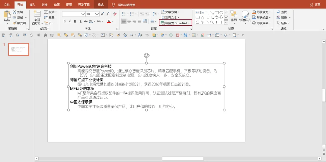 选中文本框内的文字部分,右键【转换为 SmartArt】-【其他 SmartArt 图形】。▲ 注意:是选中文字,不是选中文本框;鼠标在文本框内的闪烁状态下也可。B. 选中文本框→【开始】选项卡→转换为 SmartArt。
