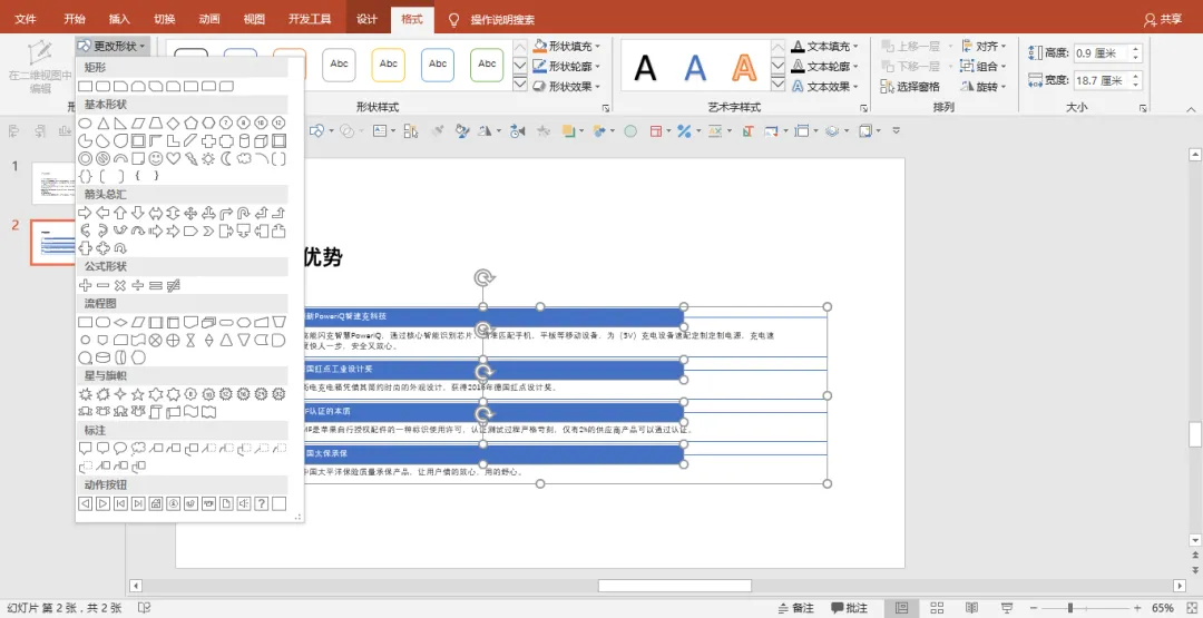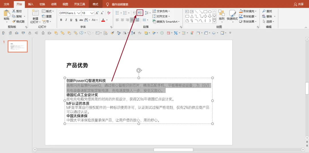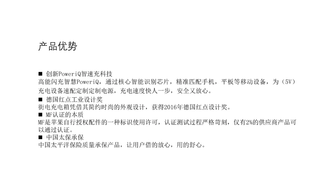 讲完了 SmartArt 的基础操作,接下来我们以下面这页 PPT 原稿为例,整理出一个 SmartArt 的使用流程 ↓先将原稿做简单处理,可通过调整字重,区分开标题和正文。原稿的主题为产品优势,文案逻辑属于并列关系。