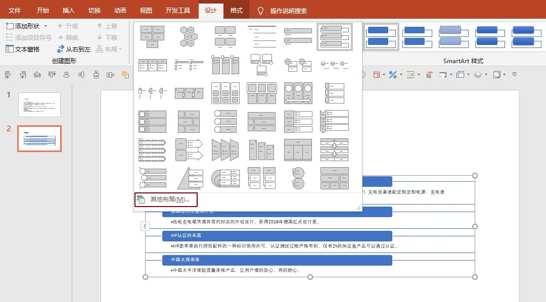 选中 SmartArt 图形→【设计】选项卡→点击【版式】下拉按钮,「其他布局」。