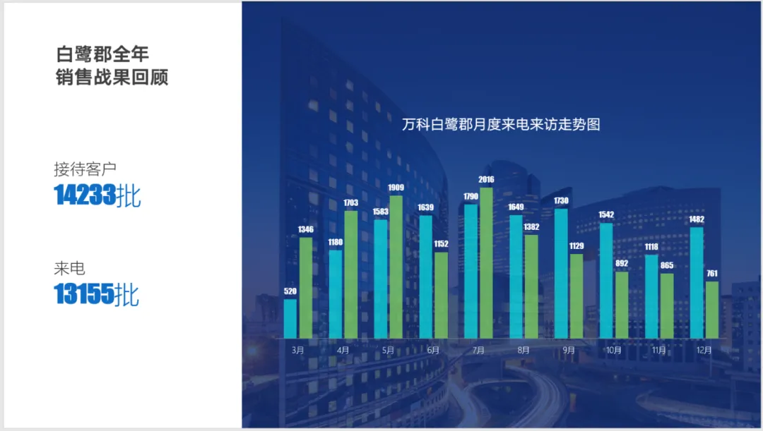 比如下面这张年终汇报,虽然视觉设计很赞,但是接待客户数量和来电数量绝对不能算销售战果: