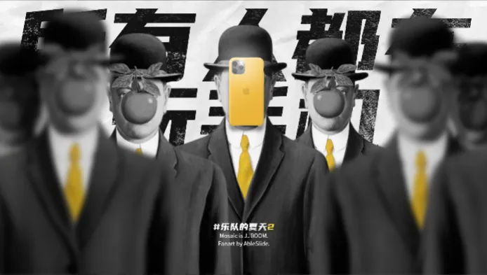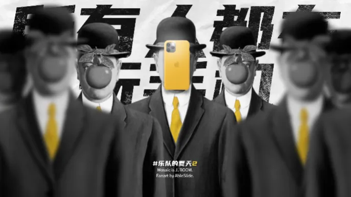 如果我们设计好一个画面之后,想要通过动画产生这样的情节对比,我们可以先做局部的动画,从某个特点出发,渐进的去烘托内容。举个栗子,当画面中有一群人排排站,你能想到怎样去做动画?大家仔细观察画面,在画面的最底部有一句话,但是因为前方的人群挡住太多了,没办法很快辨识出具体文字内容。所以我先给手机一个特写,再给中心人物制作一个登场的动画。从近景出发强调人物的状态,之后拉到中景,呈现完整的画面。在这之间有一个层层递进的关系。前后一个人和人群也有了对比效,从而增强底部文字所传达的内容。当有层层递进的手法去描述画面时,这样一个画面就会有多个画面的递进产生。