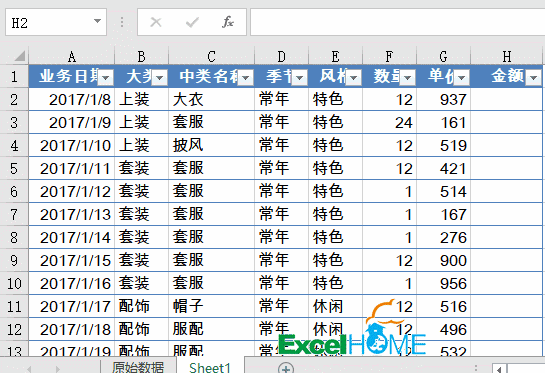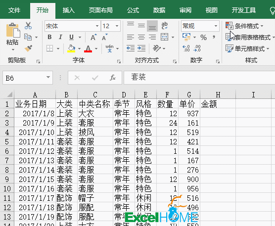 直接输入到工作表中的数据,看起来光秃秃的,实在是拿不出手。咱们可以单击数据区域任意单元格,然后依次单击开始→套用表格格式,然后设置一下字体,效果就出来了: