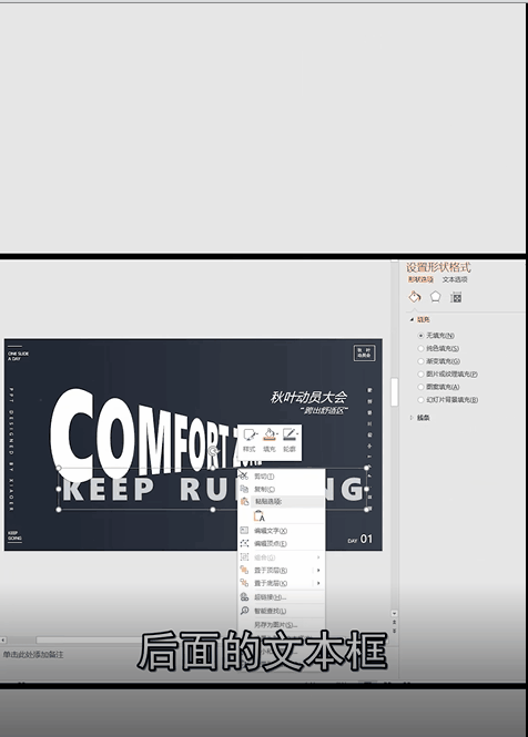 告诉你一个小秘密,其实这个 PPT 一分钟就可以搞定!❷ 选择【效果】调整【三维旋转】的 x 轴参数为 280,透视参数 40:❸ 后面的文本框进行同样的操作,X 轴、Y 轴、Z 轴和透视的参数分别设置为 300、6、0、70。调整好位置:❹ 下面的字体,和上方的操作步骤一样,X 轴、Y 轴、Z 轴和透视的参数分别设置为 75、30、260、100,略微调整一下文字的立体排版就完成啦:今天的分享就到这里啦,我们下期见!( ^_^ )/~~拜拜~今天的 PPT 小技巧学会了吗?