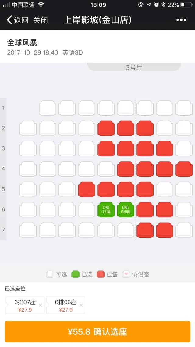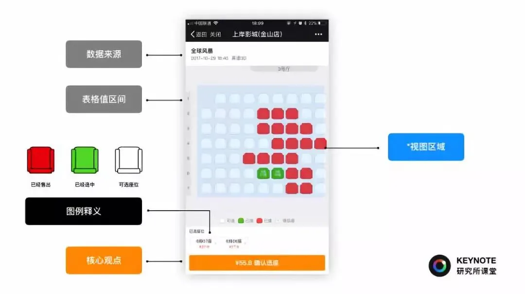 此画面给我们传达的结论是:55.8 确认选座!而在选择座位的过程中,图片传达给我们的信息来自以下 3 个关键点: