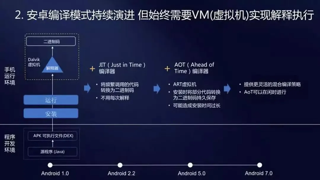 最早的时候安卓运行在一个叫 Dalvik 的虚拟机上,里面集成了一个解释器,每次用户在安卓手机上运行 APP 时,就会叫醒这个解释器,把程序翻译成机器码运行。所以最早的安卓很容易卡到飞起。