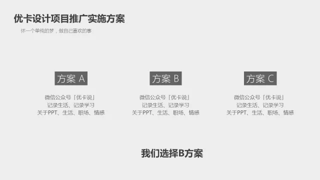 ❶ 此页制作目的,是通过对比3个方案,选出最佳方案B。
