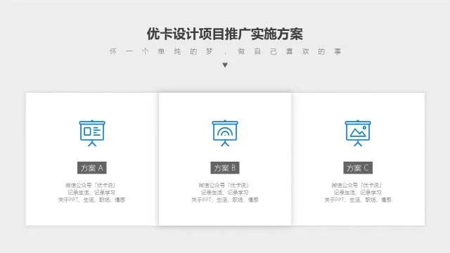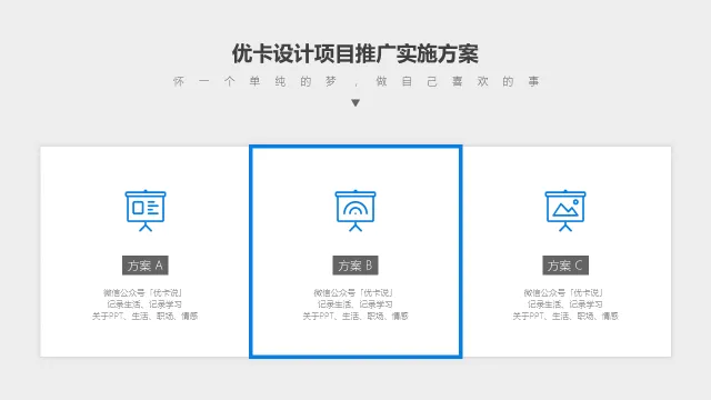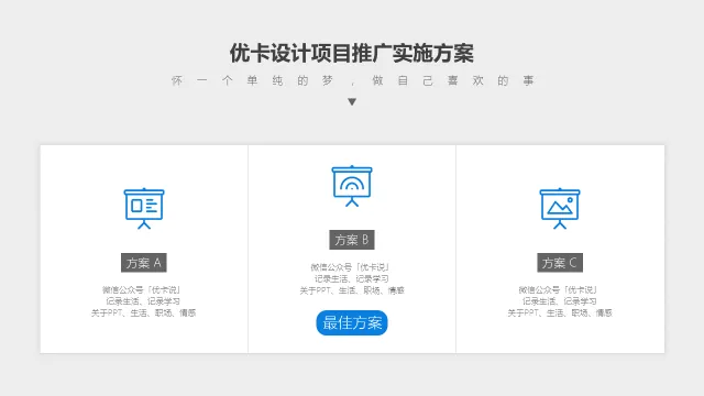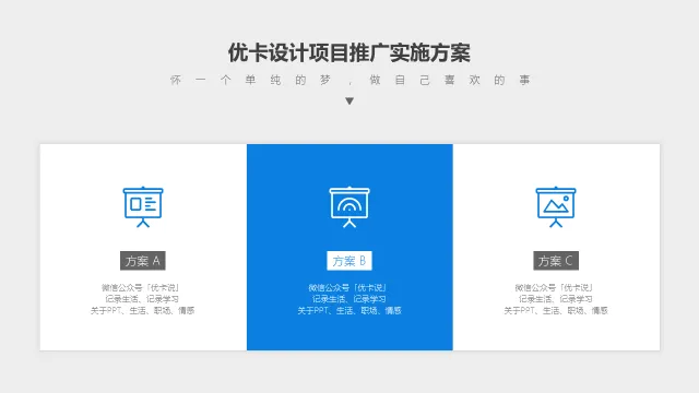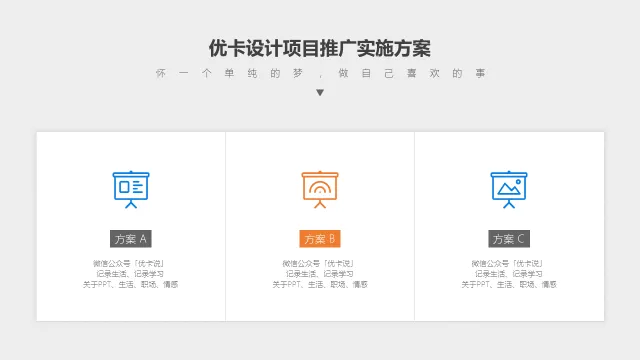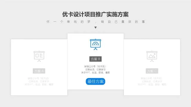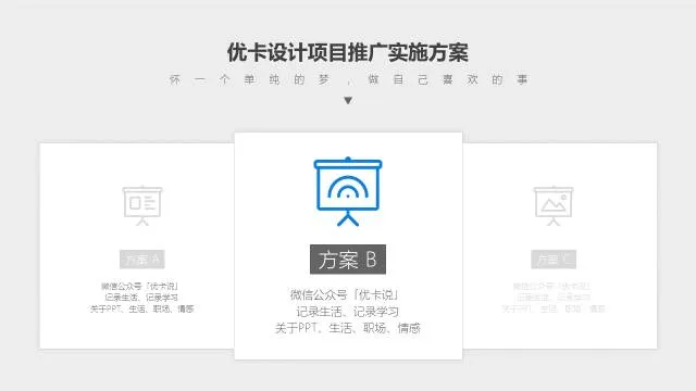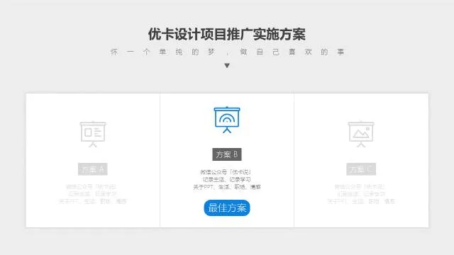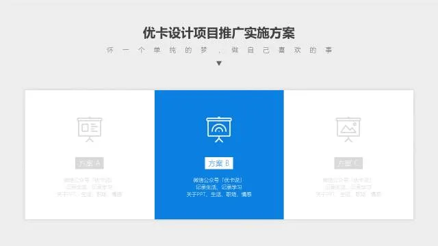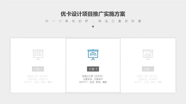 比如,你有三个方案要单独介绍,讲解完方案A之后,放一个上图所示的页面进行过度,来提示观众,第一板块方案A已经完毕,接下来进入方案B,我们一共会有三个方案需要讲解。