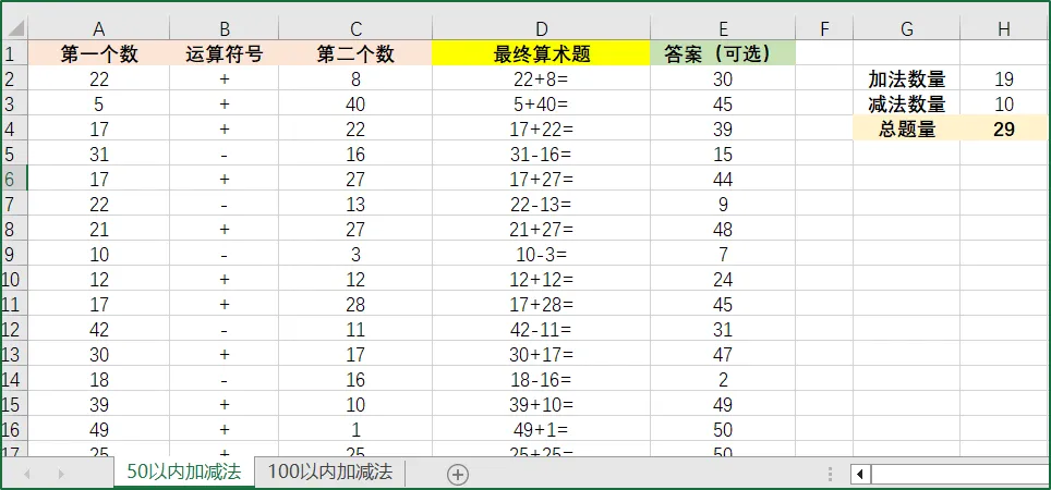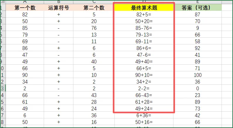 如A列生成加减法第一个数、B列生成运算符号、C列为第二个数、D列为最终算术题、E答案(可选);