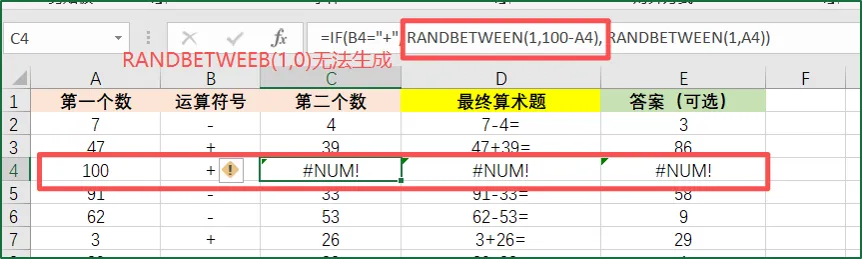 因为第一个加数为100,那么第二个数RANDBETWEEN(1,100-100)无法生成。