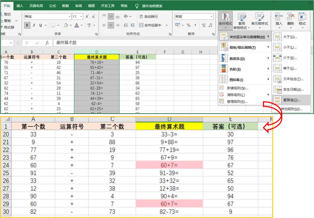 可以使用【条件格式】功能,查看是否存在相同的算术题。