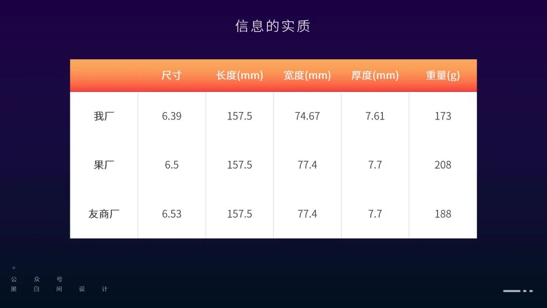 下面三张演示文稿,分别来自苹果、华为和小米发布会。细看发现它们都选择性突出某些信息,其内容本质是「表格的节选」。