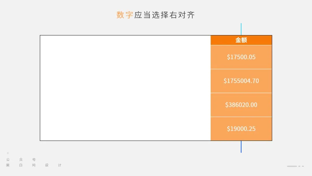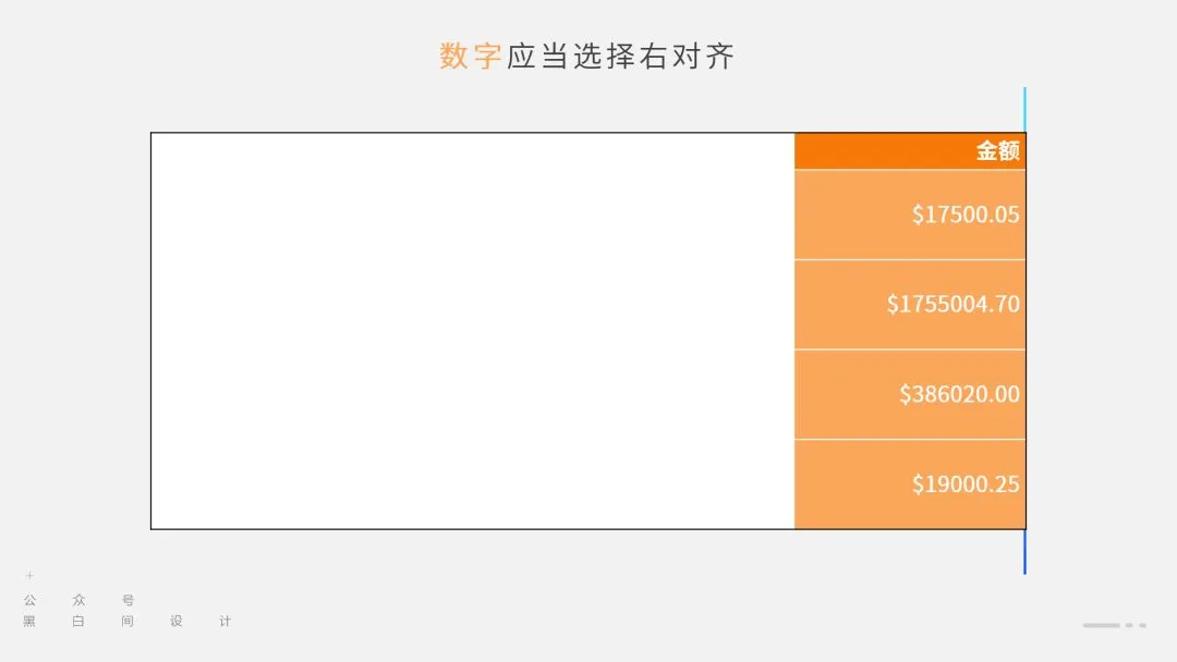 对于数字,特别是带小数点的数字,推荐使用右对齐的方式,这样,它们的大小关系更为明确。