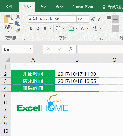 要计算两个跨天的时间之间有几小时几分,也可以使用自定义格式完成。自定义格式代码为: