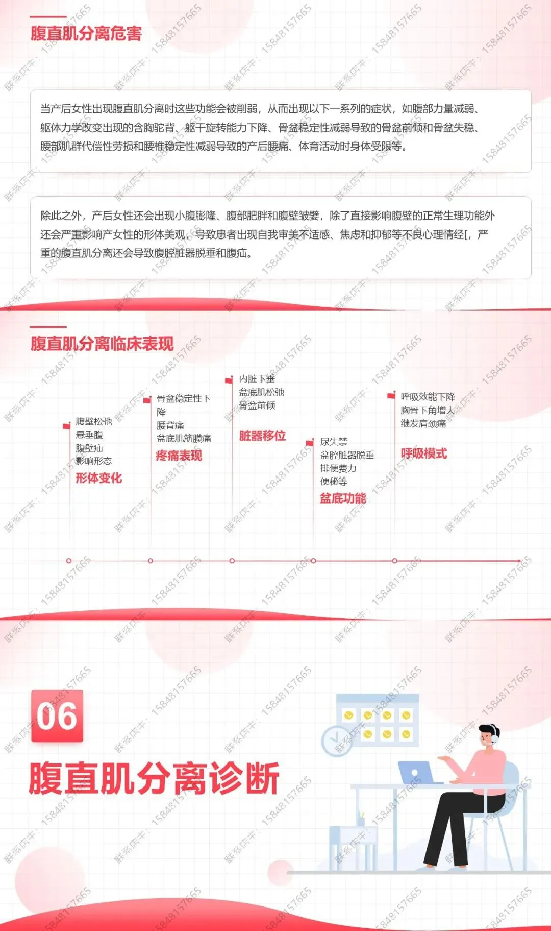 当产后女性出现腹直肌分离时这些功能会被削弱,从而出现以下一系列的症状,如腹部力量减弱、躯体力学改变出现的含胸驼背、躯干旋转能力下降、骨盆稳定性减弱导致的骨盆前倾和骨盆失稳、腰部肌群代偿性劳损和腰椎稳定性减弱导致的产后腰痛、体育活动时身体受限等。严重危害产后那不行的身体健康,降低产后女性的生活质量。