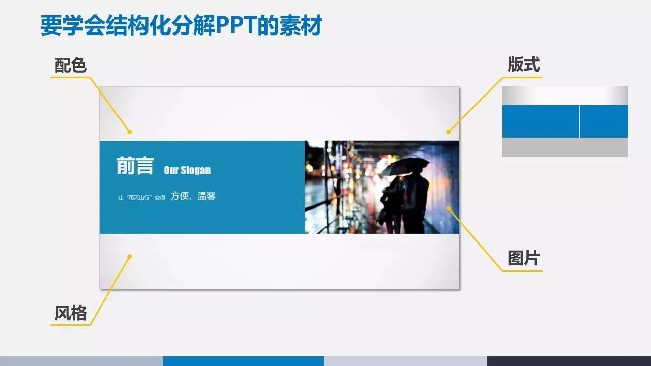 所以我们会被把它分解成一系列的素材,包括版式、风格、配色、图片。
