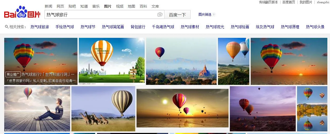 那么这样的话,你就会搜到很多不一样的图片,就像刚才我们搜“时光旅行”搜到一张热气球的图片,这个时候就有了新的灵感,可以试试“热气球旅行”啊。