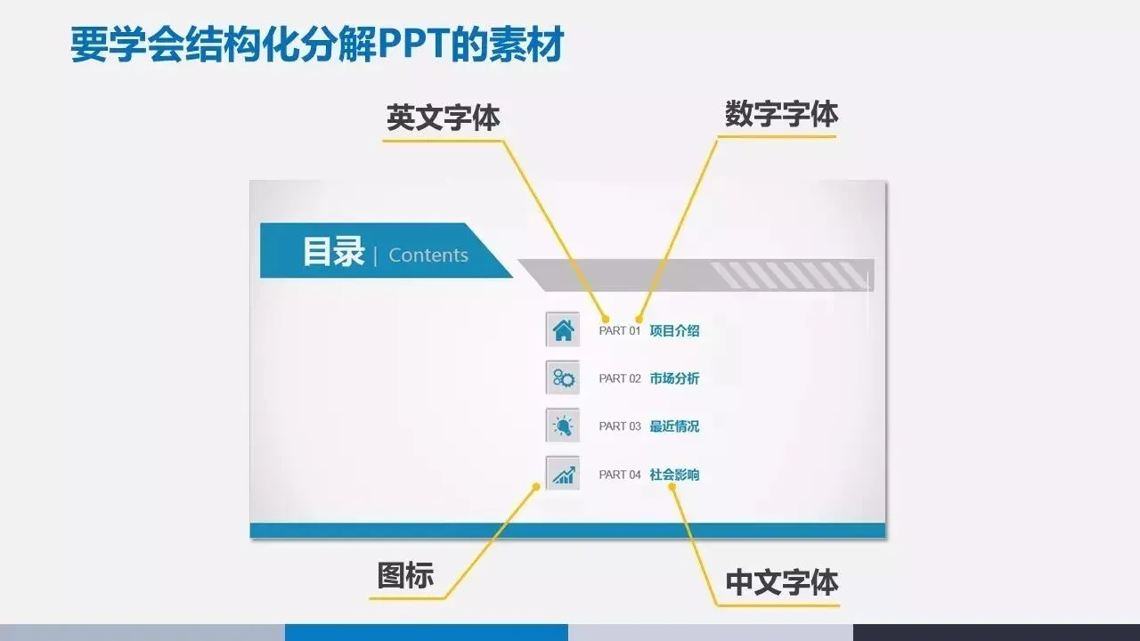 我们看到在PPT里面的字体,包含了英文字体,中文字体,数字字体,有的时候还有图标。