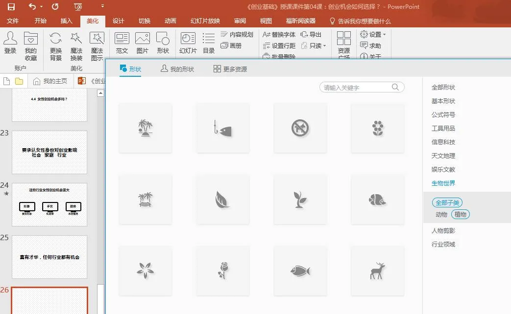 或者你就用PPT插件“PPT美化大师”,装了这个插件,你的PPT会变成这样,点形状,直接插入各种小图标。