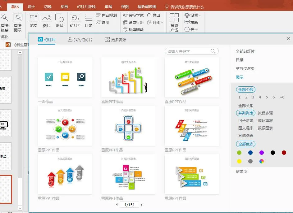 在美化大师里点幻灯片,就可以找到免费的图表和逻辑关系图!