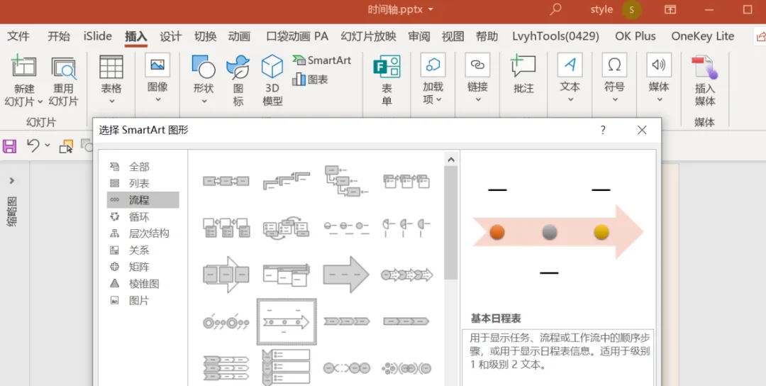比如 PPT 自带的 Smartart 功能,里面就有好多时间轴图示,可以直接套用。