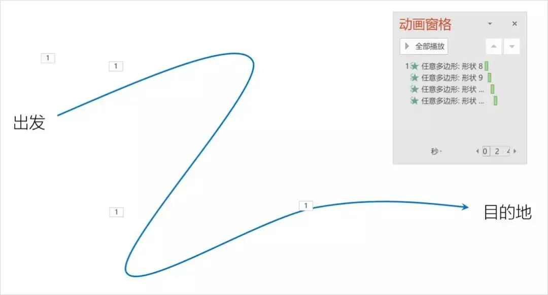框选所有线段,设置擦除动画方向分别为:右、下、右、右,将后三段动画设置为「上一动画之后」,整个擦除动画就制作完成了: