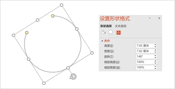 看,这就是调整好角度的弧线,此时弧线的旋转角度是148°: