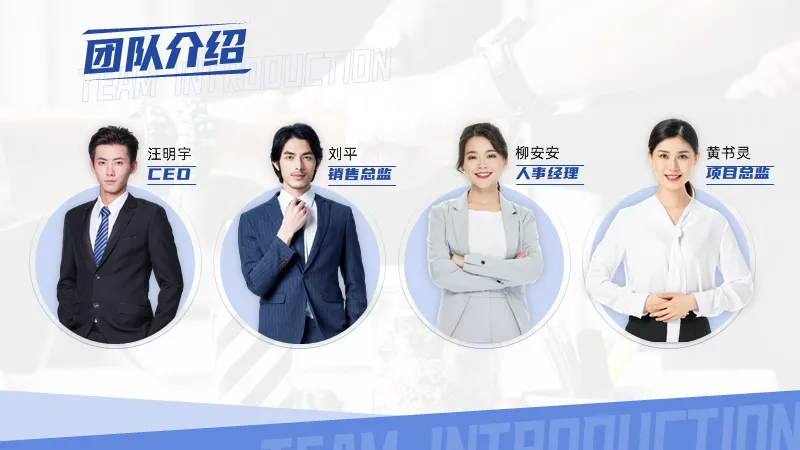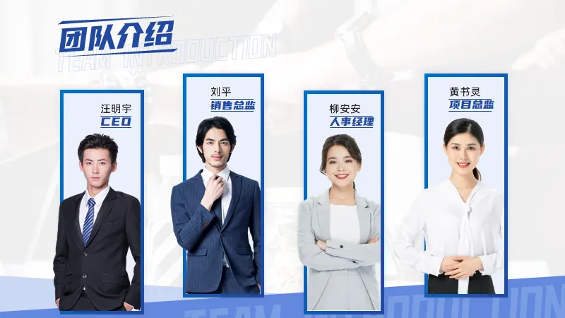 看下面这几张人物介绍 PPT,很明显可以看到每个人背后都有一个几何图形做为背景,