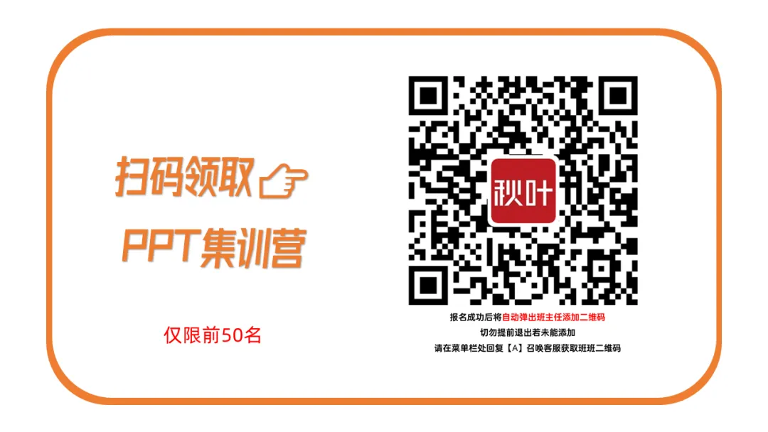 为感谢一直以来各位小伙伴的支持,秋叶 PPT 开设读者群啦!欢迎大家扫描下方二维码加入哦!群内不仅有海量 Office 资料包,还有各种职场干货分享、红包掉落等福利~