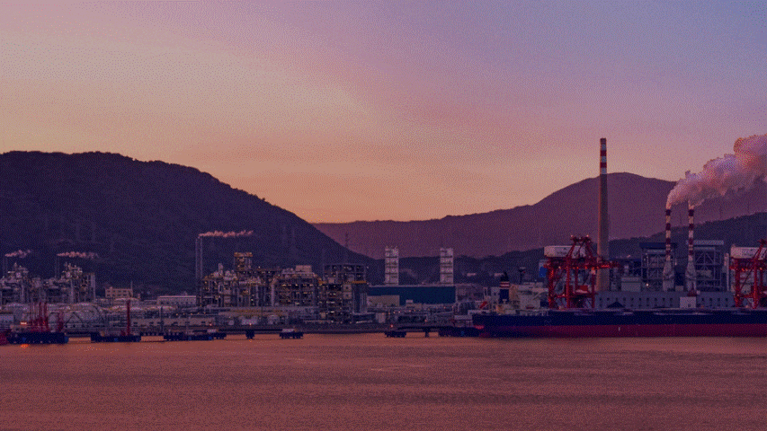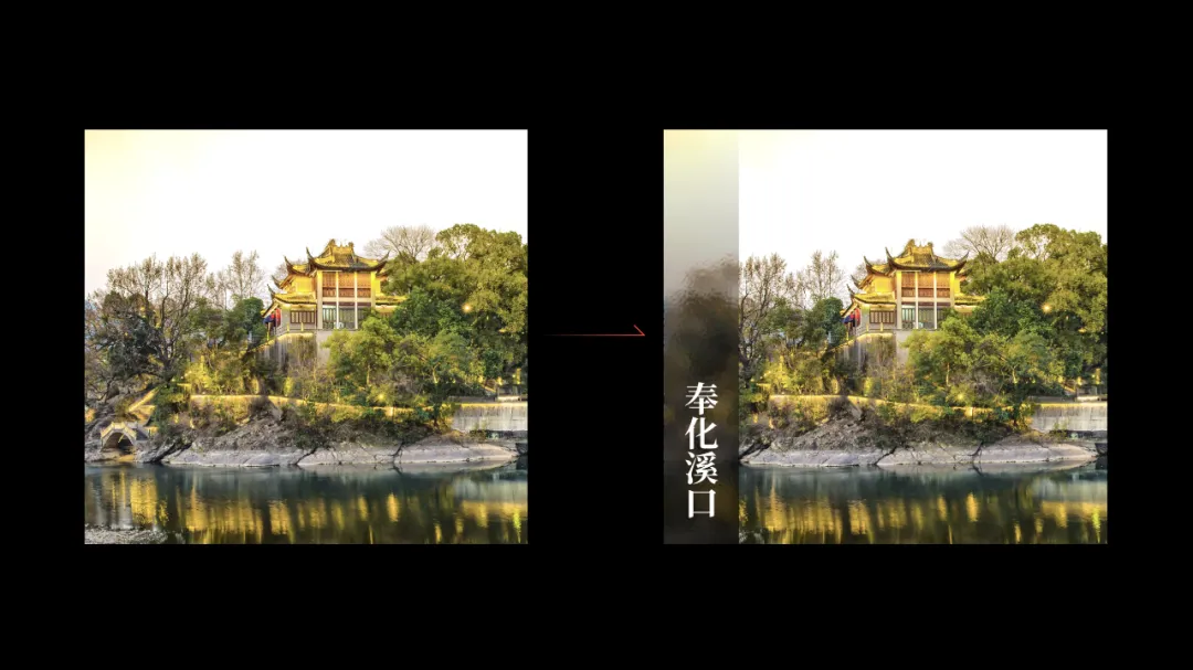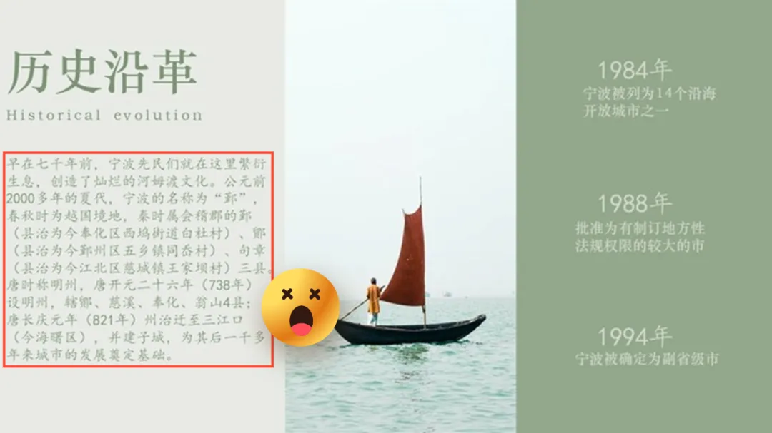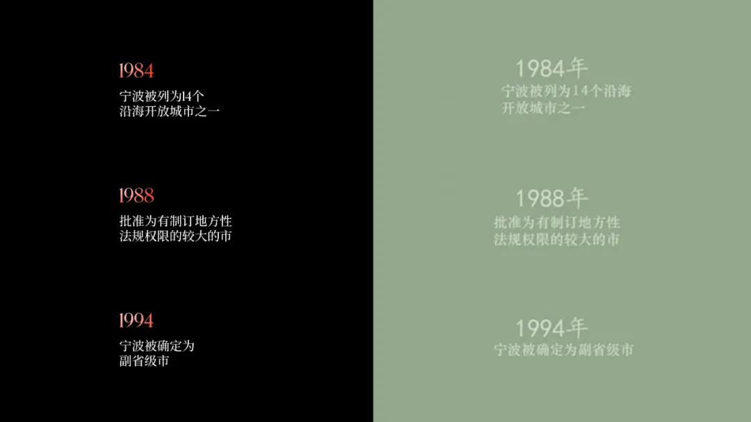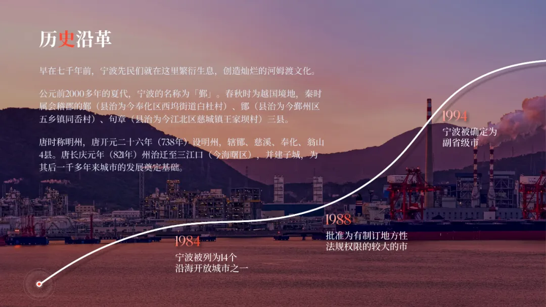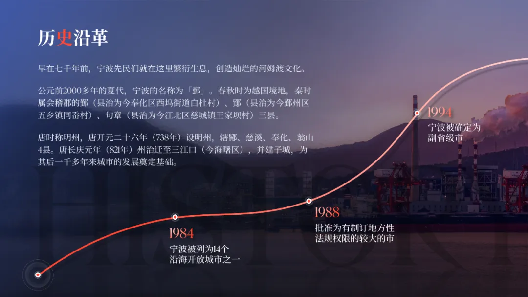 在版式上呢,我打算以时间线的形式,来排列这三个重要年份事件:接着用一张宁波港口图片作为背景,晚霞背景可以与封面色调保持一定的统一:很明显,背景干扰了信息的呈现,所以我们采用目录页的处理方式,将图片左侧部分做半透明虚化处理: