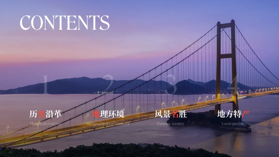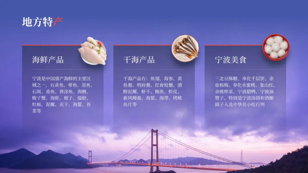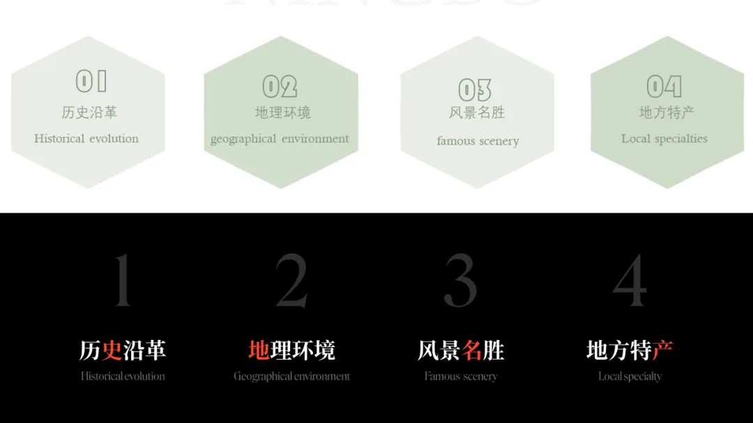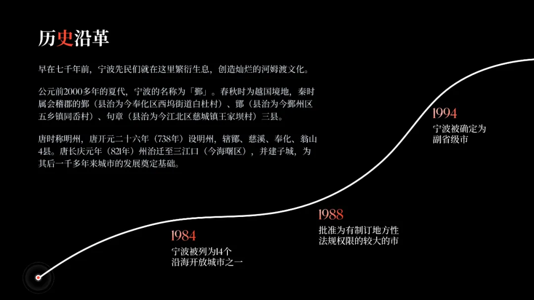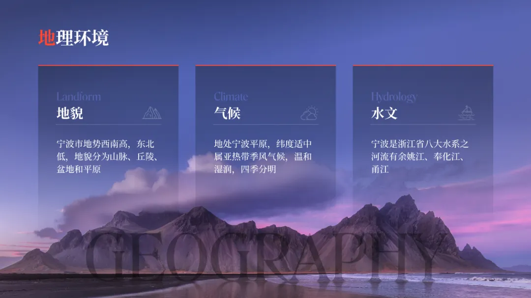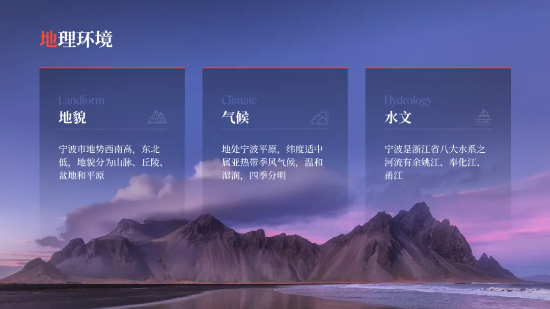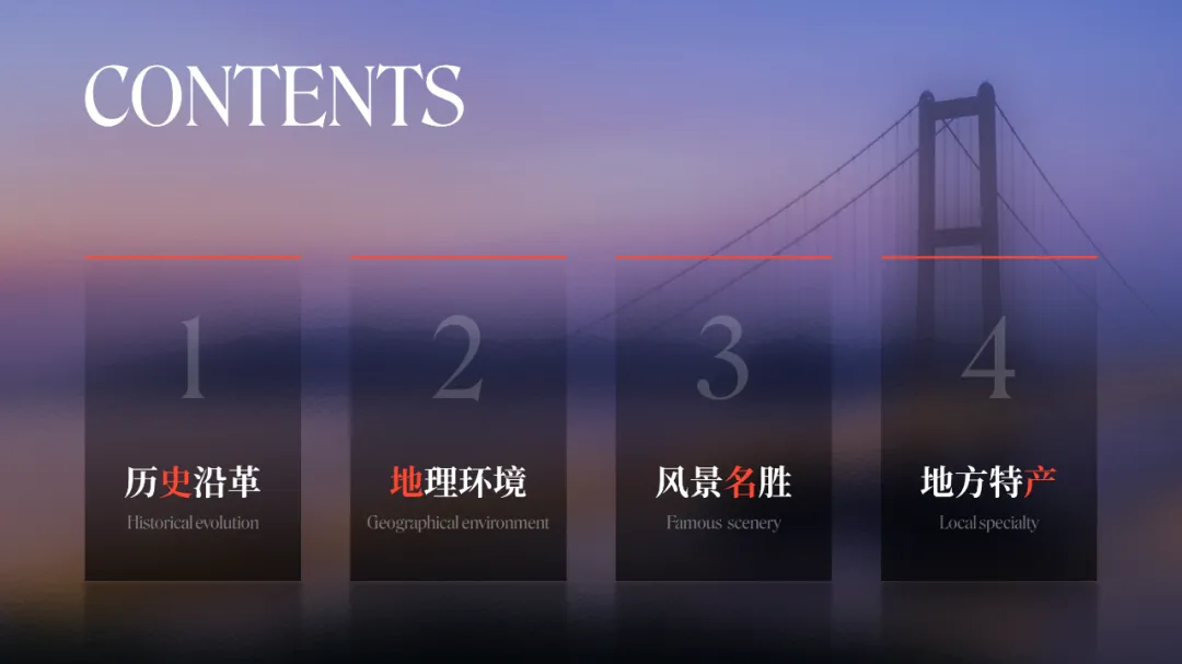 在之前的文章中,我曾修改过一位知乎网友的 PPT ,没看过的,可以点击阅读。而上个礼拜,我的一位同事,做了另外一个版本,在设计上很有新意,并且他还专门写了设计复盘。这是一份关于宁波市推广介绍的PPT。对于初学者来说,能做成这样,已经是一份合格的PPT了。但整体来看下来,有几个比较大的的问题,是需要注意的:比如典型的 Word 排版,大段文字比较多,不加处理的话,容易增加阅读成本:标题的样式没有统一,字体也使用过多,所以整份PPT看起来会有些乱:页面四周的留白也没有统一,或者留白边界太窄,导致页面失衡,没有呼吸感:今天这篇文章,就给大家分享一下我的一些修改思路,希望对你有所启发。原稿开篇包含了「宁波」二字和四个要点,感觉是将封面和目录结合成了一页:这里我将内容拆分为两页,增加了一张封面,毕竟作为第一印象的封面页,其存在还是很有必要的:像这样城市推广的PPT,一般比较适合做成全图风格,所以找了一张宁波西堠门大桥的图片作为封面背景:在字体和图片之间增加了一层半透明蒙版,这样可以适当突显文字:为了增加设计细节,将与文字相交的部分山体抠出来,覆盖在文字上面,做一个穿插的效果:接着看目录页,将文字提取出来,通过调整字号大小和字体透明度,来弱化数字英语,突显中文文字:延用封面背景可以保持视觉上的统一,但图中元素干扰了文字的清晰呈现:在之前一篇文章有提到:虚化图片可以弱化干扰元素。所以这里将背景下半部分做虚化处理:像这样的半透明虚化效果,在PPT中是怎么实现的呢?很简单,只需要两步:先复制一层背景图片,添加「虚化」艺术效果:然后借用到 OKPlus 插件的「图片透明」工具,将图片上半部分透明处理即可:继续给图片增加一个「玻璃」艺术效果,页面可以更有质感:最后我们还可以用线条和半透明矩形来修饰承载文字,效果不错吧:02