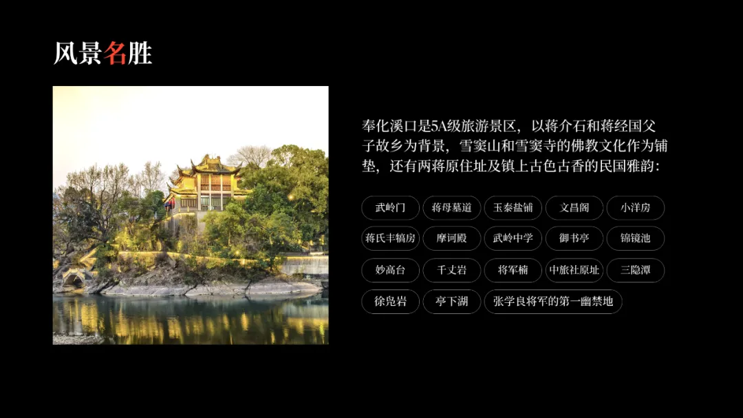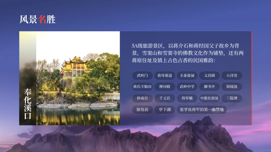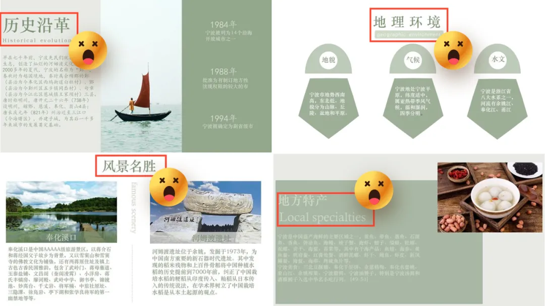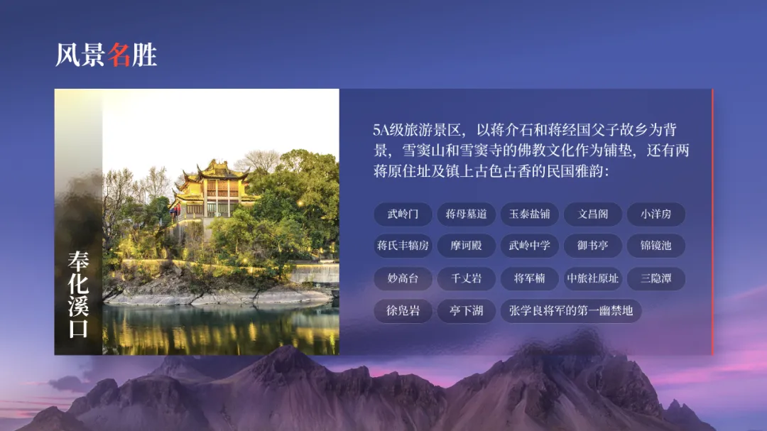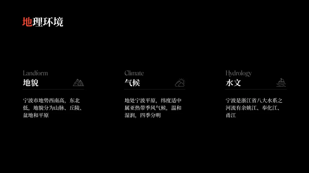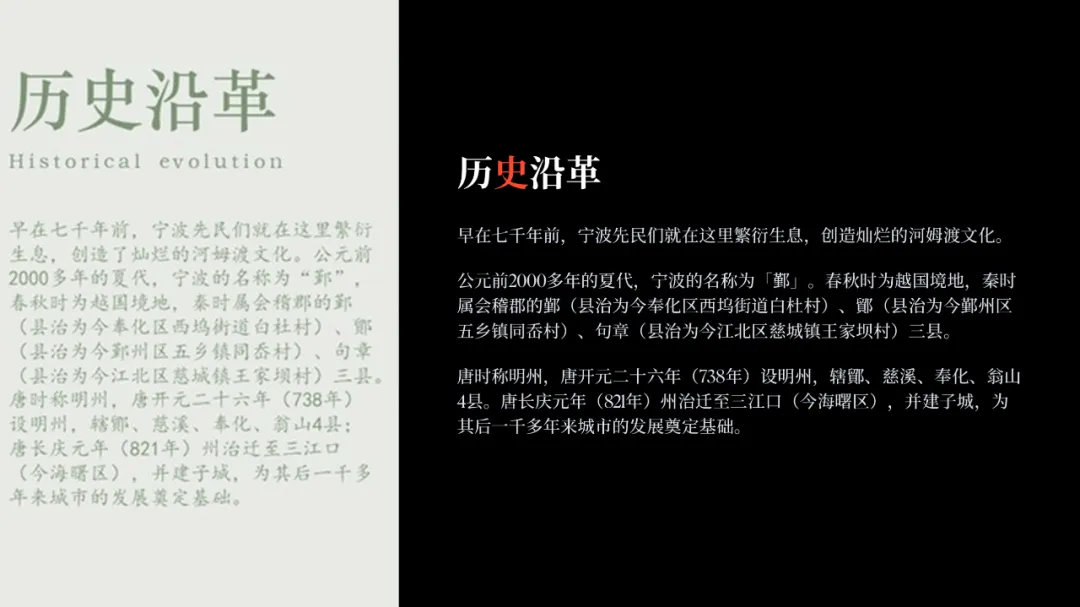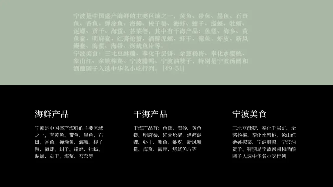 在之前的文章中,我曾修改过一位知乎网友的 PPT ,没看过的,可以点击阅读。而上个礼拜,我的一位同事,做了另外一个版本,在设计上很有新意,并且他还专门写了设计复盘。这是一份关于宁波市推广介绍的PPT。对于初学者来说,能做成这样,已经是一份合格的PPT了。但整体来看下来,有几个比较大的的问题,是需要注意的:比如典型的 Word 排版,大段文字比较多,不加处理的话,容易增加阅读成本:标题的样式没有统一,字体也使用过多,所以整份PPT看起来会有些乱:页面四周的留白也没有统一,或者留白边界太窄,导致页面失衡,没有呼吸感:今天这篇文章,就给大家分享一下我的一些修改思路,希望对你有所启发。原稿开篇包含了「宁波」二字和四个要点,感觉是将封面和目录结合成了一页:这里我将内容拆分为两页,增加了一张封面,毕竟作为第一印象的封面页,其存在还是很有必要的:像这样城市推广的PPT,一般比较适合做成全图风格,所以找了一张宁波西堠门大桥的图片作为封面背景:在字体和图片之间增加了一层半透明蒙版,这样可以适当突显文字:为了增加设计细节,将与文字相交的部分山体抠出来,覆盖在文字上面,做一个穿插的效果:接着看目录页,将文字提取出来,通过调整字号大小和字体透明度,来弱化数字英语,突显中文文字:延用封面背景可以保持视觉上的统一,但图中元素干扰了文字的清晰呈现:在之前一篇文章有提到:虚化图片可以弱化干扰元素。所以这里将背景下半部分做虚化处理:像这样的半透明虚化效果,在PPT中是怎么实现的呢?很简单,只需要两步:先复制一层背景图片,添加「虚化」艺术效果:然后借用到 OKPlus 插件的「图片透明」工具,将图片上半部分透明处理即可:继续给图片增加一个「玻璃」艺术效果,页面可以更有质感:最后我们还可以用线条和半透明矩形来修饰承载文字,效果不错吧:02
