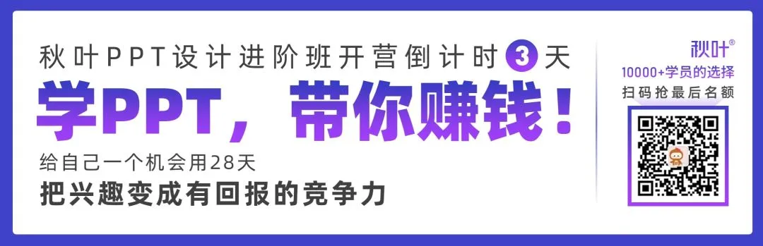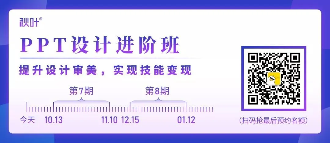 来吧!强烈推荐我们秋叶 PPT 设计进阶班:把海报设计、模板制作、配色动画、插件 AI、视觉化表达和定制一网打尽!实现思维升级,能力变现!