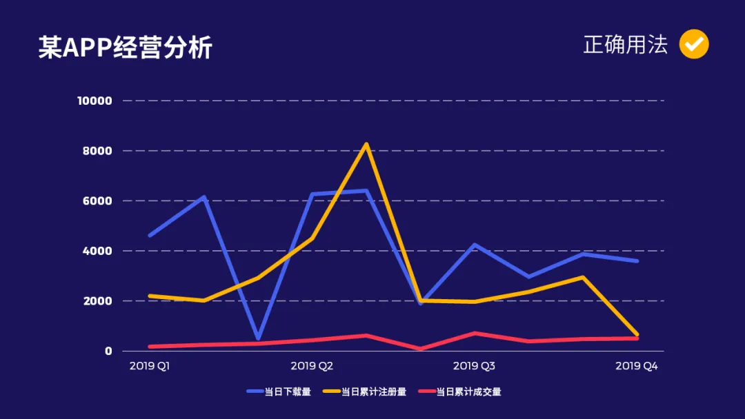 公众号后台读者增长情况,也是通过折线图表示增长趋势的例子一个例子。此外,折线图可简单分为两种:带标记点和不带标记点。带标记点,会突出每个标记点的数据情况,更注重每一个点的细节。折线图与面积图非常相似,除了外观不同,两者的区别,主要体现在两个应用场景: