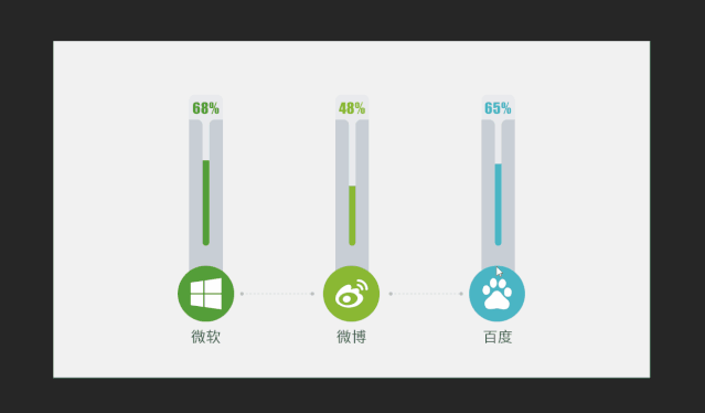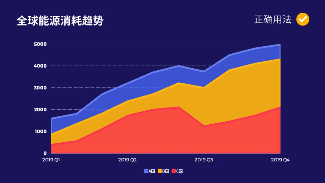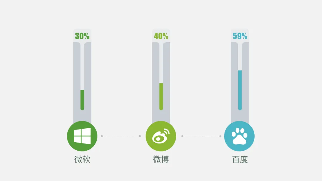 当数据包含多组数据时,面积图多层叠加会看不清,此时应选用折线图。常见的数据类型有:某广告各类展示页点击率占比、某端口不同城市访问占比等。在饼图的基础上,如果要加一个横向对比的维度,则需要把图表,转换成柱形图的变体——百分比堆积柱形图,更加直观地展示对比情况。除了选择正确的图表类型,美化图表的呈现样式,同样重要,两者都是为了让数据更直观地呈现,让用户容易看懂。然而,PPT 中自带的图表样式都不好看,这就需要我们在实际使用时进行优化。无论是图表、形状亦或是字体,加渐变都是最实在的美化方式。挑选靓丽、和谐的两个颜色搭配,结合 PPT 中的透明度调节,很轻松地,就能把图表变得更加美观。另一个美化思路,绘制几何形状,填充进图表,使图表更新颖、有表现力。❸ 填充素材