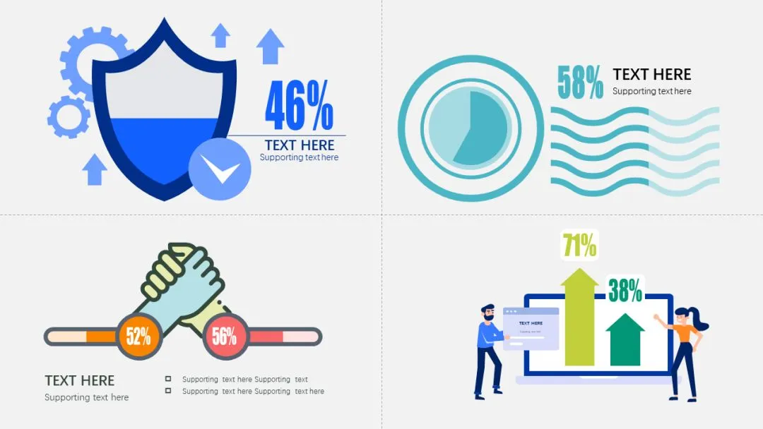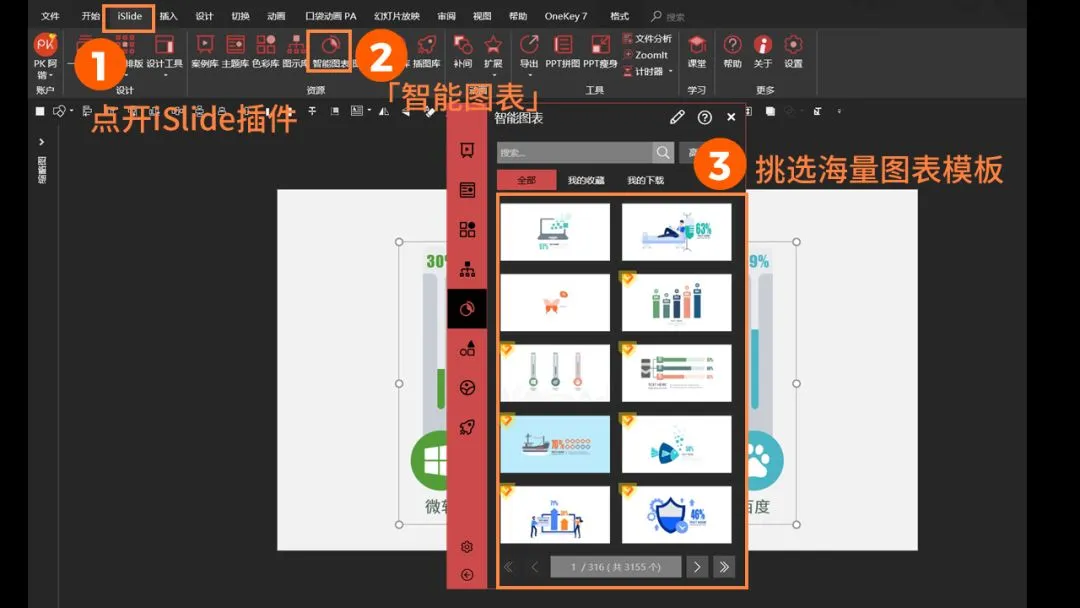 PPT 插件 iSlide 的「智能图表」,就是一个图表模板库。选择想要的图表后,PPT 会自动新生成一页包含该图表的幻灯片。智能图表库有着 3000 多个图表,这些图表制作精美,样式非常新颖,在看到这些图表之前,你是完全想象不到图表还可以是这样子的。比如前边这个温度计类的图表,如果我们自己动手制作的话,可能需要插入柱形图—插入遮盖形状—添加数据标签等,非常繁琐麻烦。而在 iSlide「智能图表」里,只需要点击一下即可生成。图表生成后,还支持二次交互式更改图表,在 iSlide 自带的智能图表编辑器里,设置新的数值,图表的数据、标签也会随着一键更改,非常方便。