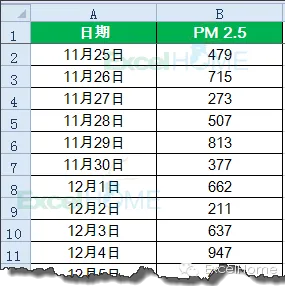 首先准备数据源,例子中是某地一个时期的PM2.5数据,当然,你也可以换成销售流水或是某个阶段的其他数据。