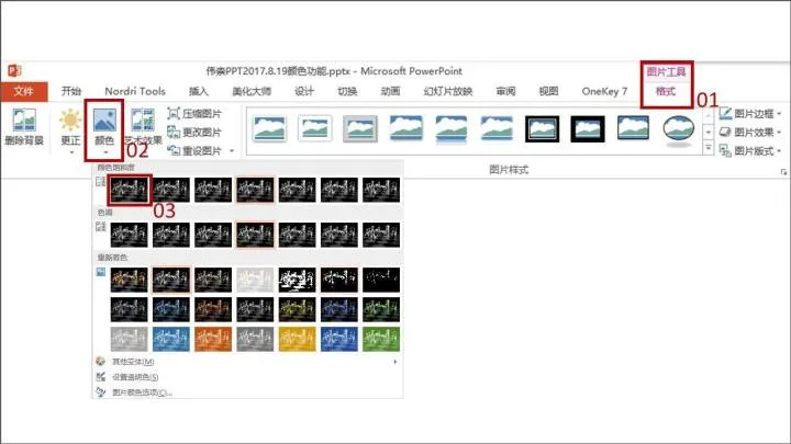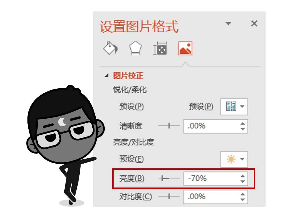 选中图片,在【设置图片格式】中,将【亮度】向左滑动: