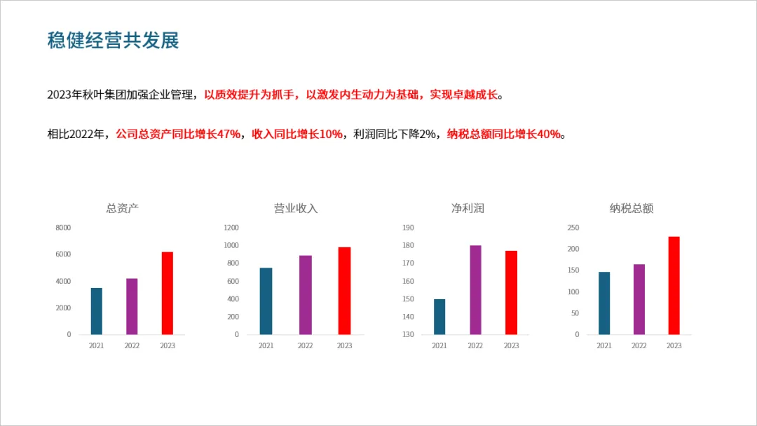 如果我们想要突出 2023 年的公司运营情况,可以将前两年的柱形图填充为灰色,2023 年的填充为主题色: