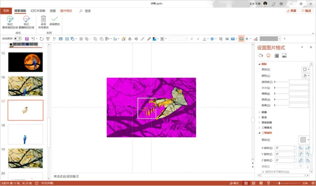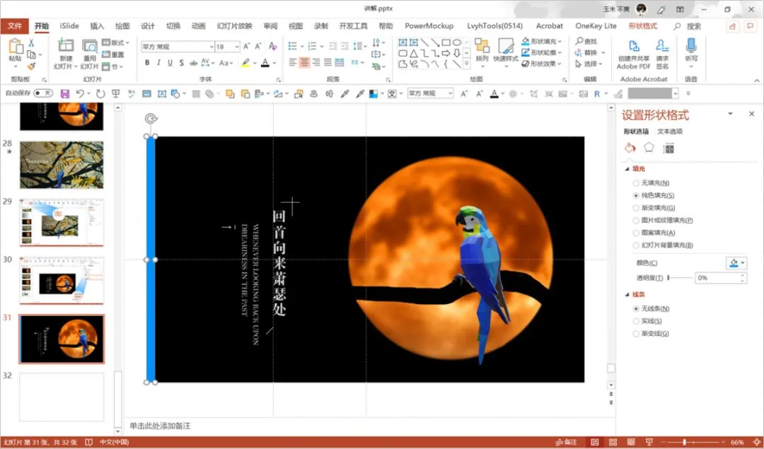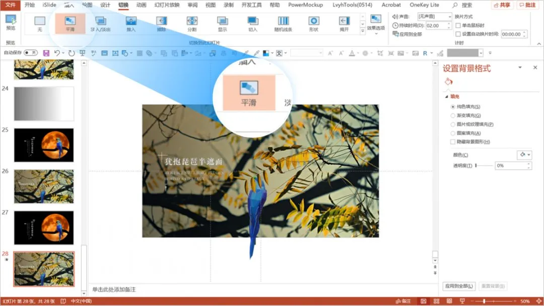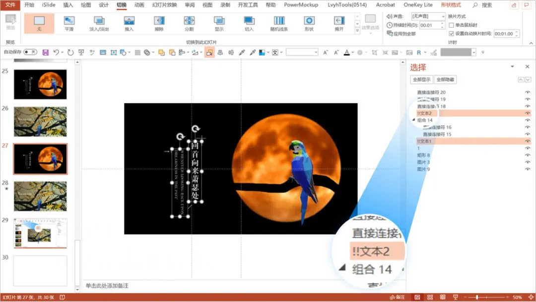 作为职场人,我们总会使用 PPT 制作各类报告、策划案等......也许我们制作的 PPT 内容丰富、干货满满,但没有吸引人目光的页面,缺少新意。下面几页 PPT 都使用了穿插设计,效果如何,你瞧。下面我将从 3 个方面,通过多个案例,为大家介绍穿插效果制作的技巧;和文字遮挡类似,形状遮挡就是形状被部分素材遮挡住了。这样将形状放在后面一层,让其被遮挡住,加上动画,也有不错的效果。和前文类似,素材被遮挡起来,可以打造层次分明的视觉效果。我最喜欢最后一个,不论是左边孙悟空和笔刷形状的穿插,还是是右边流浪地球背景与地球的穿插,都十分惊艳。首先,我们把 3D 素材放入一个合适的场景,并调整合适的角度。那么问题来了,「这鸟的素材是怎么藏在叶子下面的?」其实很简单,复制一份背后的图片,把叶子的部分用 PPT 抠图抠出来,放在最上层就可以了。大家也可以看出来,这里文字看不清,所以我们加个从左到右的蒙版。其实就是利用了 PPT 中的切换效果【平滑】,即把第二张幻灯片的切换效果换成「平滑」。PS:平滑动画只能用在 Office 365 和 Office 2019 的版本上。你可以从前面的动图看到,两种幻灯片的竖排文字变成了横排文字。打开选择窗格,将需要做成过渡的元素以「!!+名称」命名。大家可以看到,原图有个从左至右的渐变动画,这是因为我在第一张图中藏了个黑色矩形。如果仅是这样的话,两张 PPT 在过渡的时候,会出现令人尴尬的空白。那就是,把第二张 PPT 的背景图片复制一份,放在第一张 PPT 的底层,让它完全被覆盖住。今天我们学习了通过素材叠放、遮挡,打造 PPT 的层次感,你都 Get 了吗?当然,又快又好搞定工作中的 PPT,除了层次感,我们还需要提高自身的技能水平!比如:一键自动排版、Word 快速转 PPT……超多 PPT 高效小技巧,都在《工作型 PPT 应该这样做》网课!今天小叶特地为你申请了 50 元优惠,到手价仅需 199 元~