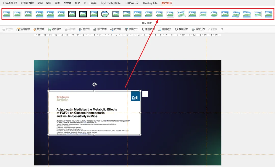 选中 PPT,在最上方的选项卡中,有一个自带的「图片格式」,里面预设了很多样式,相当于一键美化: