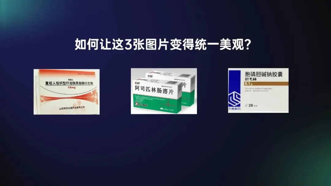 重点表达正确了,我们继续提升美观度,这页最大的难点,就在于 3 个药物的图片,图片里的药物,尺寸不同、视角不同、甚至个数也不同: