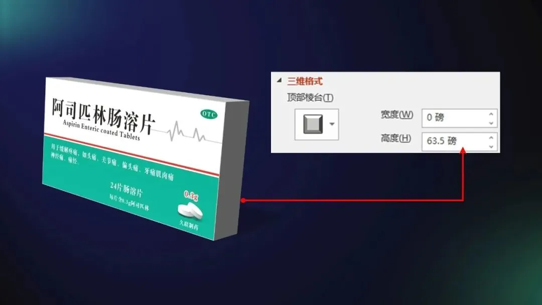 之后,再选中图片,在「三维格式」中的第一栏「顶部棱台」中,「宽度」设为 0,增加「高度」: