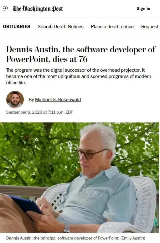 据《华盛顿邮报》9月8日报道,当地时间9月1日,PPT的发明者丹尼斯·奥斯汀(Dennis Austin)在美国加利福尼亚州洛斯阿尔托斯(Los Altos)的家中去世,享年76岁。