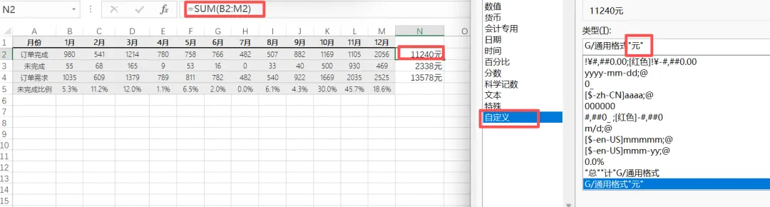 效果:单元格输入100,显示为“100元”,但实际值仍是100,可以正常求和,