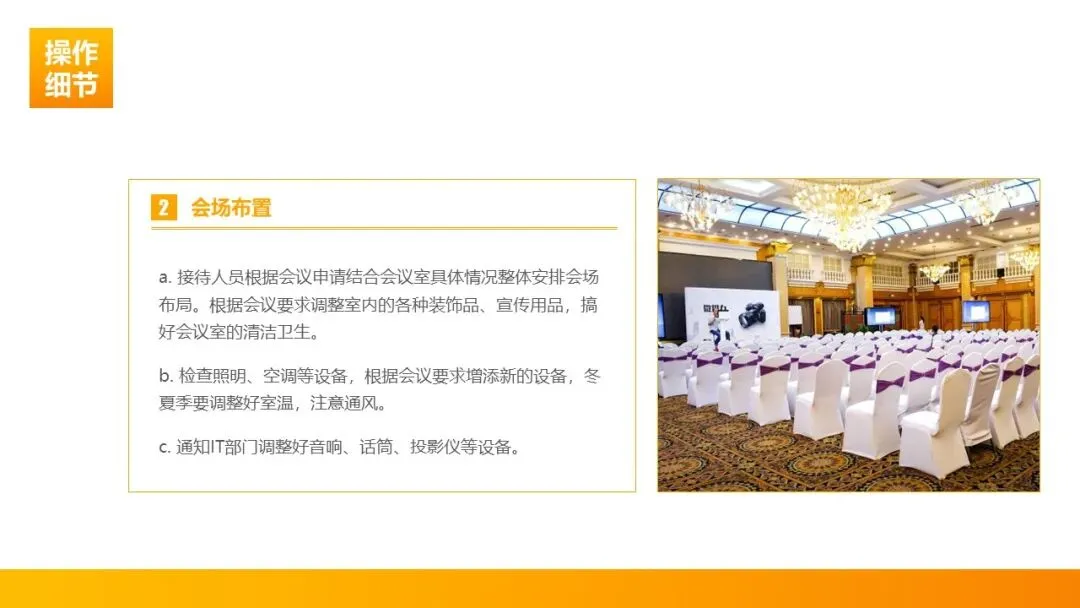 2. 精心布置,兼顾实用与舒适:按会议需求调整会场布局,做好全方位清洁;提前检查照明、空调、音响、投影仪等设备并调试到位,提前 30 分钟完成设备最终确认;将室温调节至体感舒适范围(夏季 25℃-27℃,冬季 20℃-22℃),让宾客进入会场即感舒心。